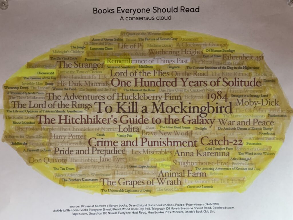 At some point in the aughts**, a friend shared a word cloud with me of “Books Everyone Should Read.” I wanted to read more of The Classics, and here was a beautiful roadmap for becoming more well-read. I began highlighting each book I’d read and worked on filling out the whole thing. Along the way, Tim Musselman undertook the same project, and it became a friendly competition as we chronicled our progress, reviews, and ratings of each book on the list. I finished first, but granted, I had a headstart. And Tim often took issue with my preference for audiobooks over print.